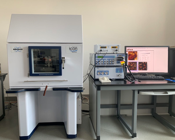 扫描探针显微镜利用具有纳米量级曲率半径的微探针在样品表面往复扫描,通过探测样品与纳米探针之间的相互作用力来获取样品的基本物性,主要用于测量材料的表面形貌、粘弹性、压电力、摩擦力等表面性质。Dimension Icon 型扫描探针显微镜主要测试功能包括:表面三维形貌(粗糙度)测试、静电力显微镜(EFM)模式、磁力显微镜(MFM)模式、摩擦力显微镜(LFM)模式、压电力显微镜(PFM)模式、导电原子力显微镜(C-AFM)模式、扫描电容显微镜(SCM)模式、开尔文探针力显微镜(KPFM)模式等。
