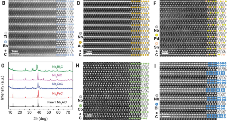 图1、论文中的部分原子像:Ti3SbC2(图B)、Nb2AuC(图D)、Nb2(Pd0.5Sn0.5)C(图F)、Nb2CoC(图H)、Nb2Bi2C(图I)