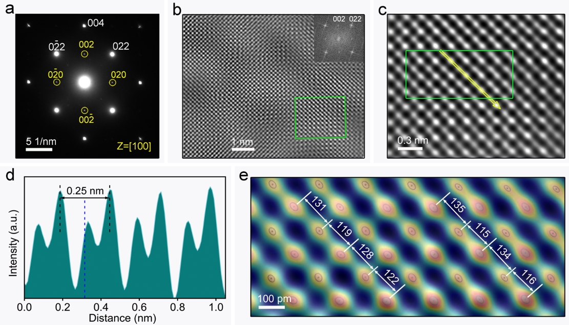 近期中国科学院宁波材料技术与工程研究所江南团队成功制备了大尺寸 (9×9×1 mm)金刚石单晶, X 射线衍射谱显示其具有较强的 (002) 衍射峰,表明其含有新型金刚石结构。公共技术中心球差校正电镜室利用亚原子尺度成像表征,结合皮米精度原子位置识别技术,证实了金刚石中碳原子在皮米尺度存在不同程度的周期性定向位移,并分析了碳原子位移的物理机制,提出了新的结构模型(Subdisordered Structures)解释新型金刚石结构特征。第一性原理计算表明,金刚石的带隙随着原子偏移距离的增加而迅速减小(当原子偏移17.5 pm 时,金刚石带隙从5.5 eV下降到0.5 eV),与实验结果(新型单晶金刚石电导率是传统单晶金刚石的106倍)一致,因此,皮米尺度原子位移引起的金刚石带隙变化为调控金刚石电子特性提供了新的思路。